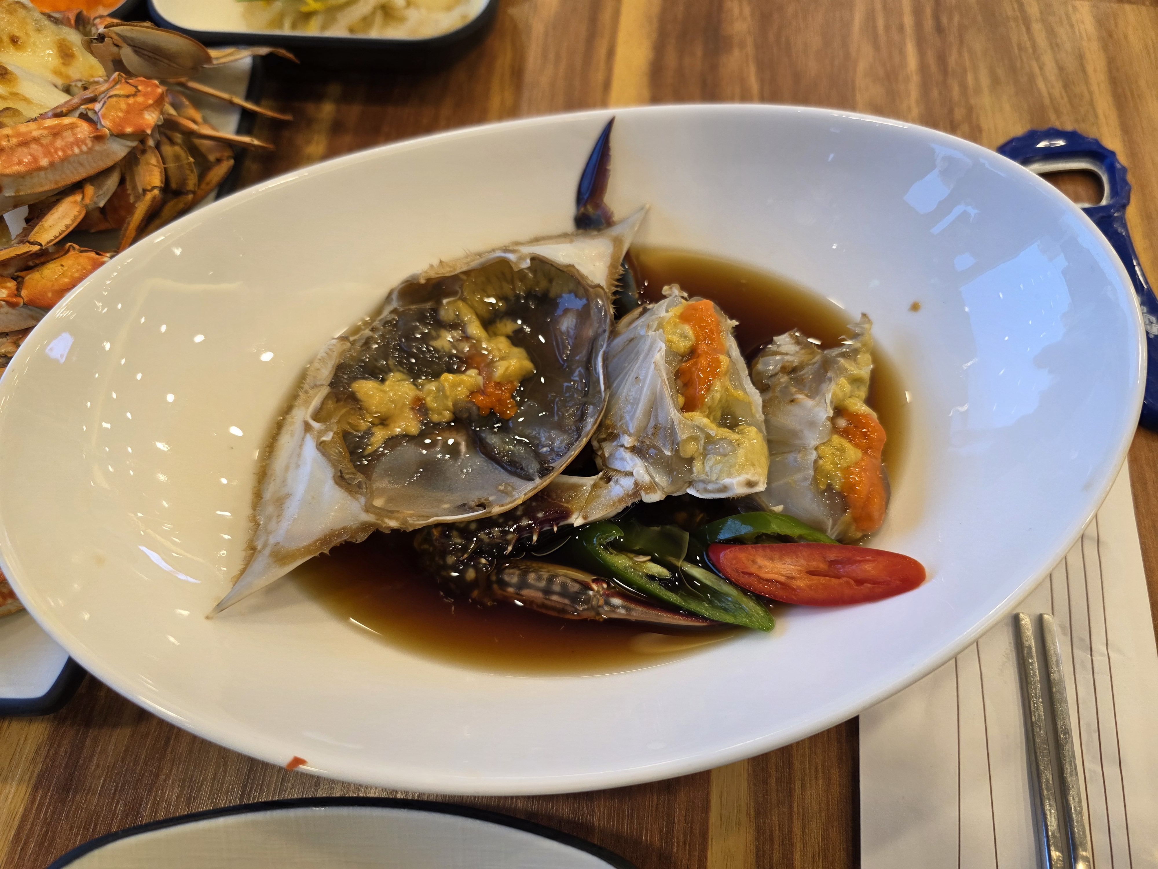 그리고 기대했던 꽃게 치즈구이도 등장했다. 고소한 치즈가 듬뿍 올라간 꽃게 요리는 비주얼부터 색다른 매력을 가지고 있었다. 한입 먹어보니 치즈의 부드러움과 꽃게의 짭조름한 맛이 의외로 잘 어울렸다. 기존의 게장이나 꽃게탕과는 또 다른 매력을 느낄 수 있는 메뉴였다.