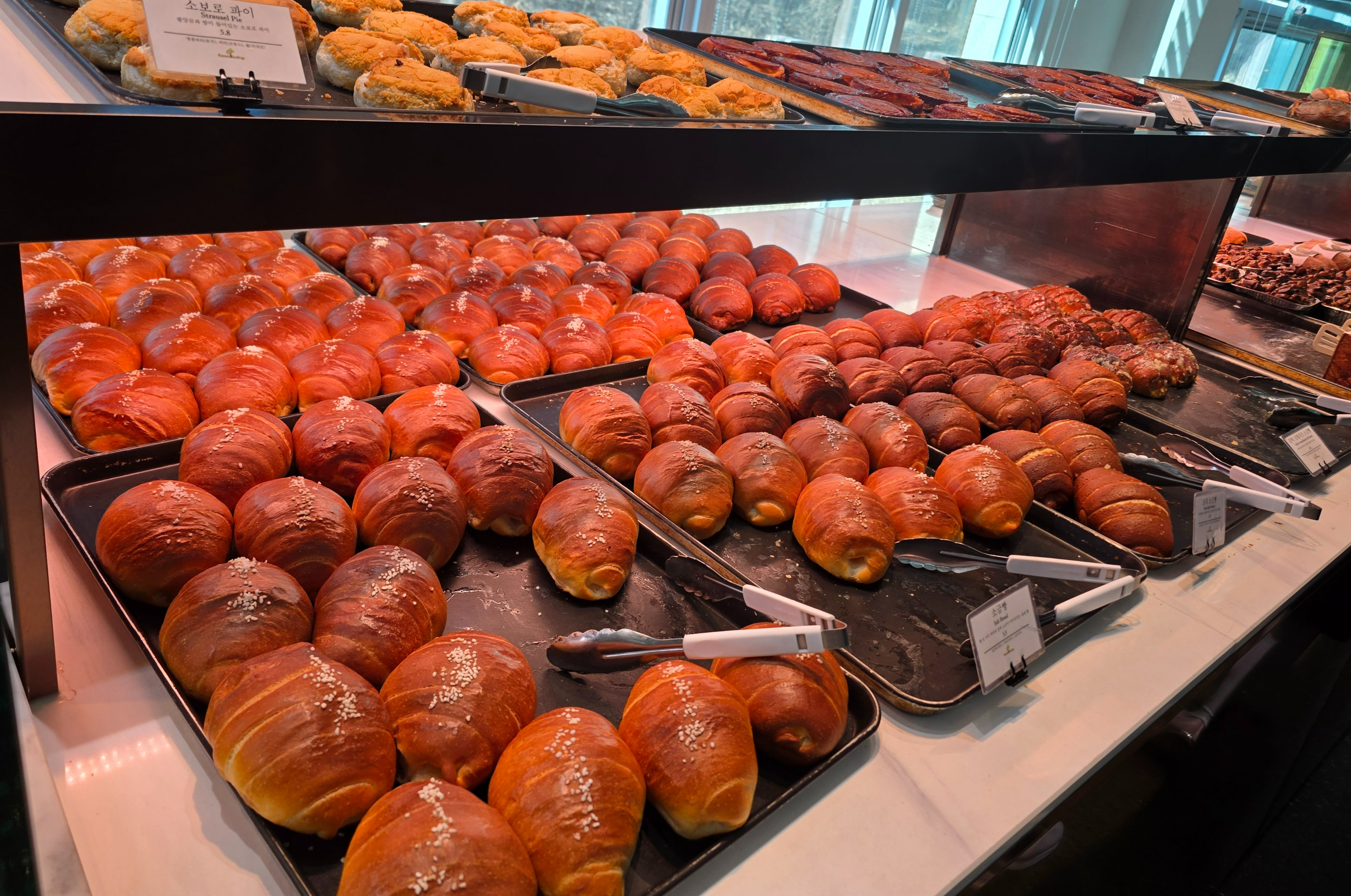 건물은 무려 4층 규모로, 외관부터 압도적이다. 높은 천장과 통유리, 그리고 곳곳에 배치된 나무와 초록 식물들이 자연스럽게 어우러져 있다. ‘걷고, 보고, 머무르는 공간’으로 들어서면 가장 먼저 빵 냄새가 반긴다. 매장 한가운데 넓게 펼쳐진 베이커리 존에는 종류도 다양한 빵들이 가득 진열되어 있는데, 눈으로 보는 재미만으로도 이미 절반은 만족한 느낌이다.