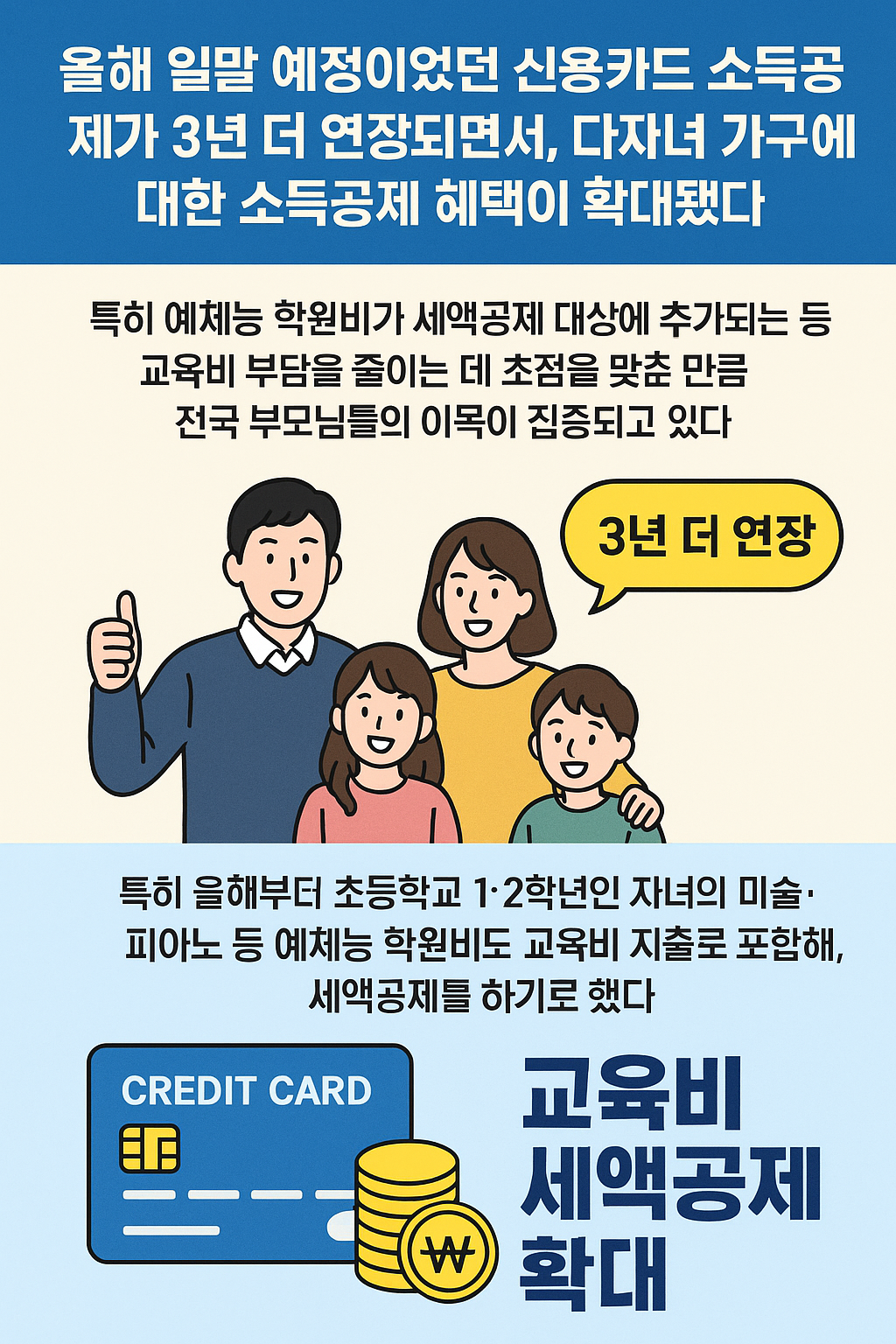 이번 글에서는 2025년 신용카드 소득공제 연장과 확대된 다자녀 가구 혜택, 예체능 학원비 세액공제 추가 내용, 그리고 카드사별 교육비 특화 카드 상품과 현명한 활용법까지 상세히 정리해 보겠습니다.